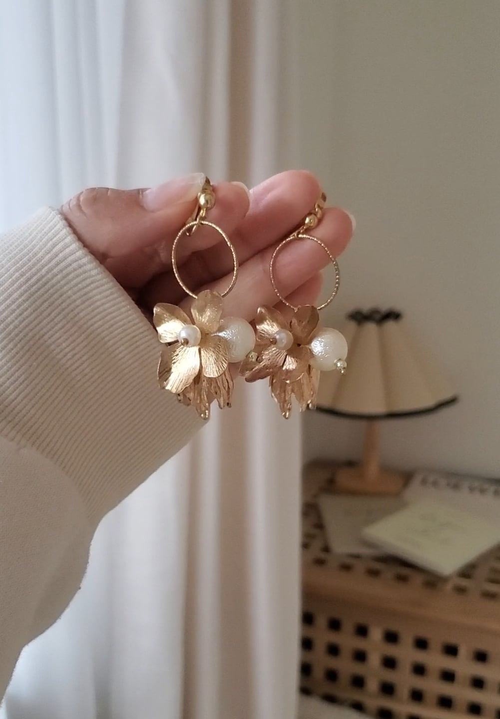 ゴールドの花びらパーツにパールを組み合わせた優しい雰囲気のアクセサリーです。